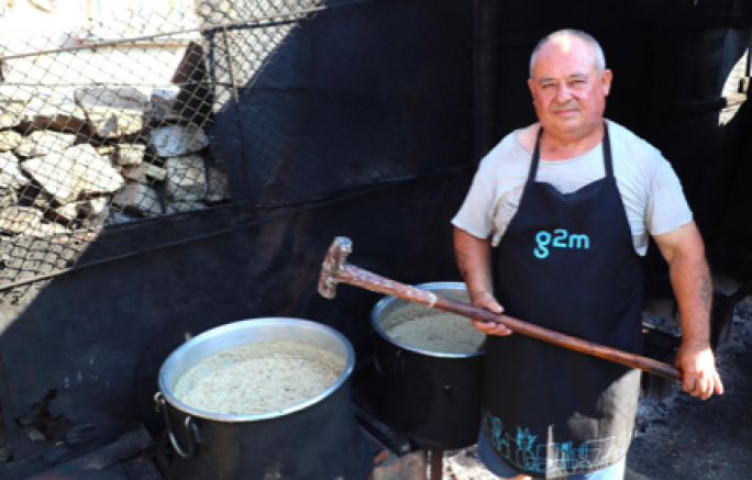 Usta aşçı Ferad, “İşin püf noktalarını yakınlardaki Borovitsa köyünden rahmetli pilav ve keşkek ustası Mümün Çolak'tan öğrendim. Keşkek buğday, tereyağı ve dana eti ya da tavuk etinden oluşan geleneksel bir yerel yemektir. Büyük bir kazanda sürekli ateş üzerinde pişirilir. Her yıl mevlitler ya da özel günler için yaklaşık 400 kazan keşkek hazırlıyorum,” diyor .