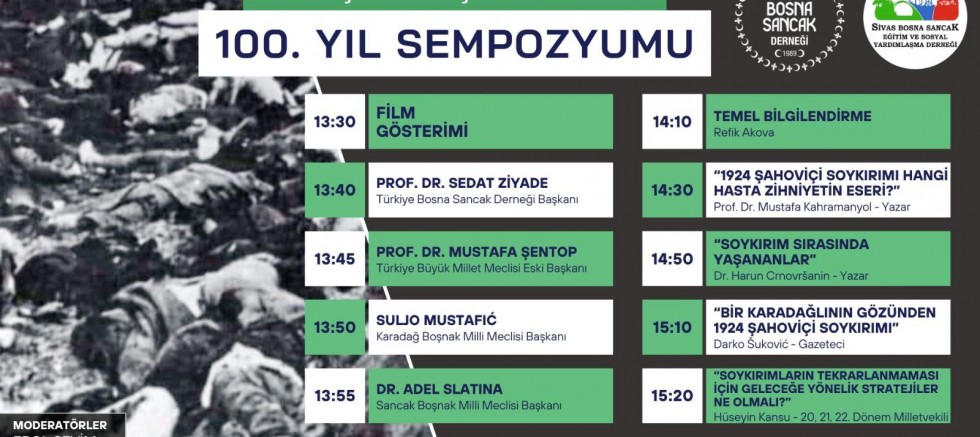 Türkiye Bosna Sancak Derneği ve Sivas Bosna Sancak Eğitim ve Sosyal Yardımlaşma Derneğinin düzenlediği 1924 Şahoviç Soykırımı 100.Yıl Sempozyumu 9 Kasım Cumartesi günü Yıldırım Mahallesi Tunca Sokak No: 2 Bayrampaşa/İstanbul adresinde yapılacak