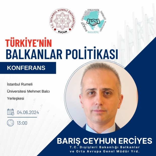 İstanbul Rumeli Üniversitesi ve BAL-GENÇ Gençliği Stratejik İş Birliği Platformu işbirliğiyle 4 Haziran Salı günü saat 13.00'te "Türkiye'nin Balkanlar Politikası" konferansta T.C. Dışişleri Bakanlığı Balkanlar ve Orta Avrupa Genel Müdür Yardımcısı Barış Ceyhun Erciyes görüşlerini aktaracak.